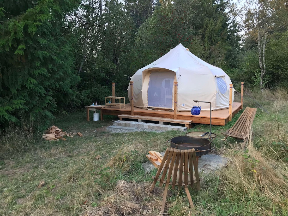 An off-grid canvas bell tent, set in the horse pasture on our multi-generational 23 acre family farm. Secluded, rustic, quiet, and peaceful, this glamping site is set up for you to come and relax. The tent has a queen size bed, interior stove, an outdoor fire pit and cooking grill, and walk through the forest to a faerie glen! No electricity or running water currently are available, but potable water and battery bank provided. 25 minutes from the airport, 30 minutes to Seattle and Puget Sound!