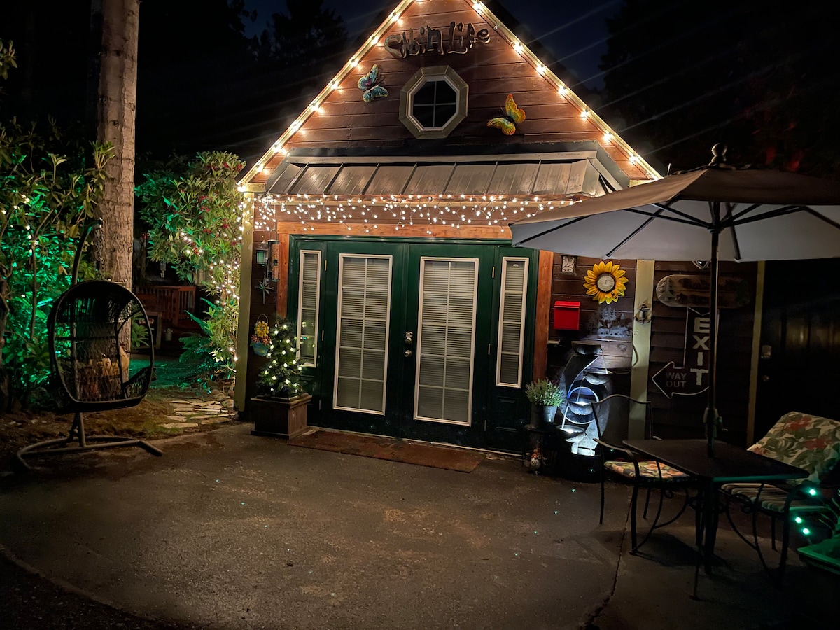 Calling all nature & movie lovers! Enjoy our cottage nestled atop our 2.5 acre forested property. Whether you are glamping for one night or looking for a longer stay, you'll find everything you need here. Amenities include: - Easy keyless check-in - 84" home theater, surround sound - WiFi, Cable TV - 1,000+ movies, 100+ board games - Fully stocked kitchen - 5 ft. shower with rain spout - Washer/Dryer - BBQ and picnic area - Private gated property - Front porch overlooking the forest
