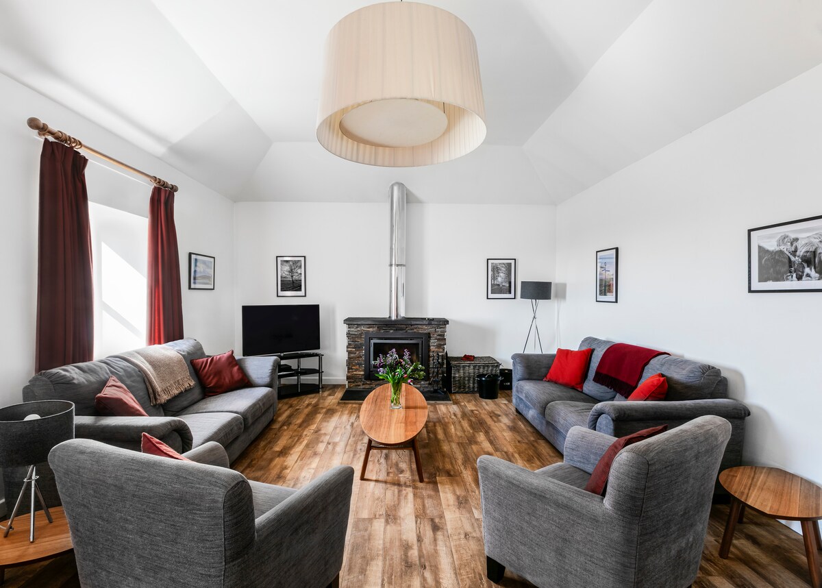 Come and stay at Ambrisbeg Cottage where we offer spacious and modern accommodation for our guests. Stunningly situated 2 minutes from the peaceful Loch Quien with its spectacular views to Arran. Comprising of a large bedroom with Kingsize bed, fully equipped kitchen with large seating area, comfy sitting room and the highlight our gorgeous slipper bath..big enough for two! Beautiful garden and countryside views from every window. Seating areas with fire pit to stargaze. Perfect getaway.