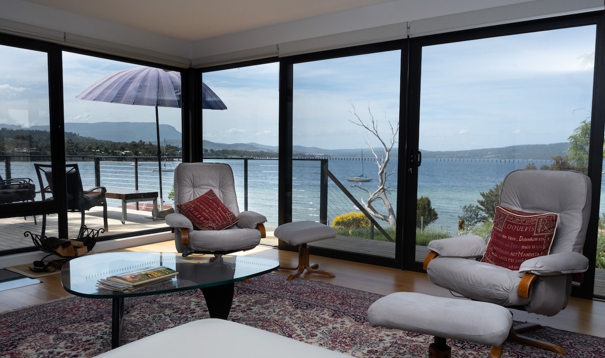Stay in one of the only Bruny Island waterfront properties that has spectacular ocean and mountain views from the living/dining/kitchen and bedroom, not to mention the enormous deck. Relax in bohemian luxury on 2 acres of natural bush and garden in the former art studio, now a private guest home, complete with unlimited WIFI. Full of artwork and Persian rugs, this is a place to unwind and absorb the peace and amazing views, especially at sunset, with uninterrupted access to the water's edge.