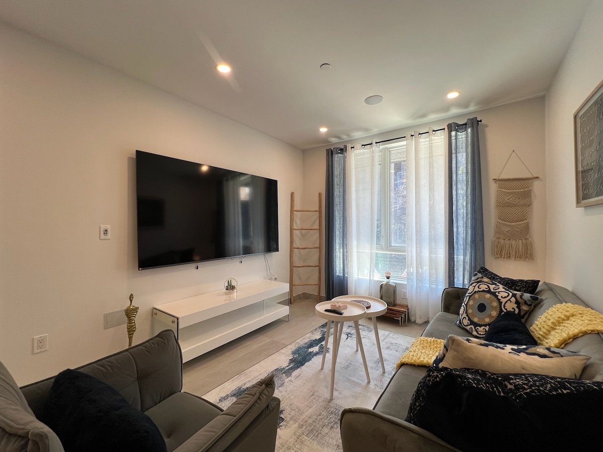 Experience modern luxury in this stunning, sunlit 1BR luxury bath suite in Greenpoint. Enjoy smart-home features, a sleek kitchen with stainless-steel appliances, and an 80″ Smart TV. Relax in the bright bedroom with a plush queen bed and unwind in the spa-style bath with a rainfall shower. Free private parking, elevator access, and a prime Brooklyn location near cafes, parks, and the subway make this stylish Greenpoint gem a perfect stay.