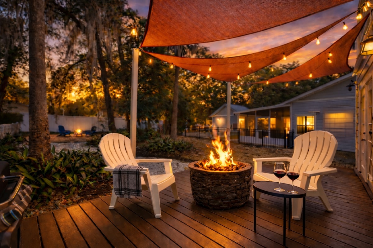 Walking distance to all Downtown Mount Dora has to offer! Our lovely 2 bedroom, 1 bath 1940s cottage has been recently renovated. Features fully outfitted kitchen, deck with gas grill and outdoor firepit. Comfortable and elegant living space with 65 inch smart TV. Primary bedroom features King bed and smart tv. Second bedroom has two cozy twin beds. Bikes available for use. Whether you’re coming to relax, boat, shop or partake in one of Mount Dora's many festivities, consider staying here!