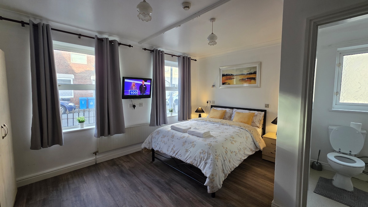 Fabulous newly renovated luxury apartment with awesome location to Hull Marina. The Fully fitted kitchen contains a fridge, freezer, dishwasher, washer dryer, electric oven, induction hob, toaster, microwave & kettle. Living area luxury sofa, Smart TV and French doors opening to a Juliet balcony. Bed 1 has a Kingsized bed, fully fitted wardrobes with chest of drawers in each, smart TV Bed 2 has 2 larger single beds, smart tv, and open wardrobe Bathroom has bath, separate shower & Vanity Unit