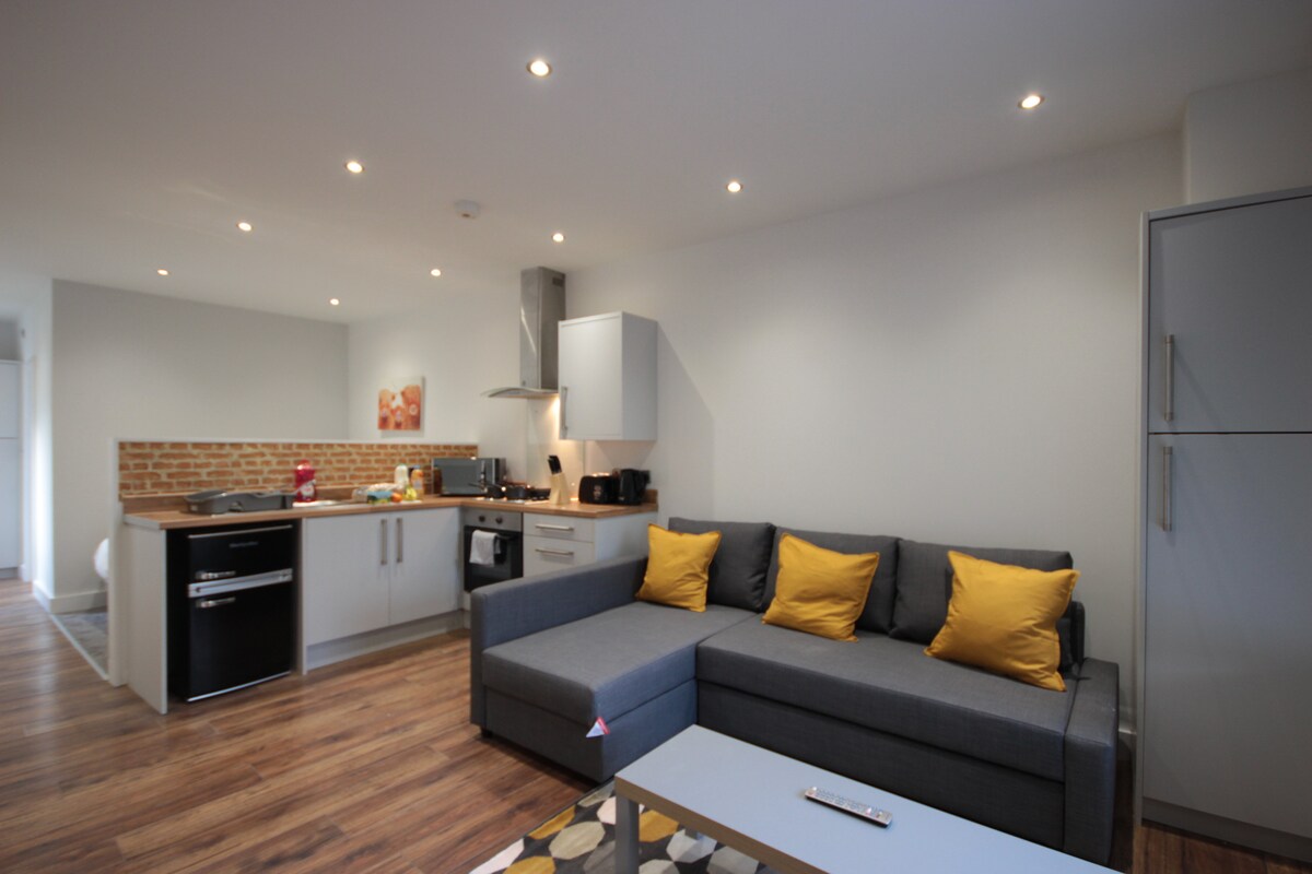 Modern 1-Bedroom Apartments | Binding House, Hull Contemporary 1-bedroom apartments in Hull city centre, each with a spacious double bedroom, modern bathroom, sofa bed, fully equipped kitchen and free WiFi. Located steps from Queens Gardens, shops, bars and restaurants, with cinemas and museums nearby. Perfect for short stays, business trips or relocations. No on-site parking, but long-stay off-site options available.