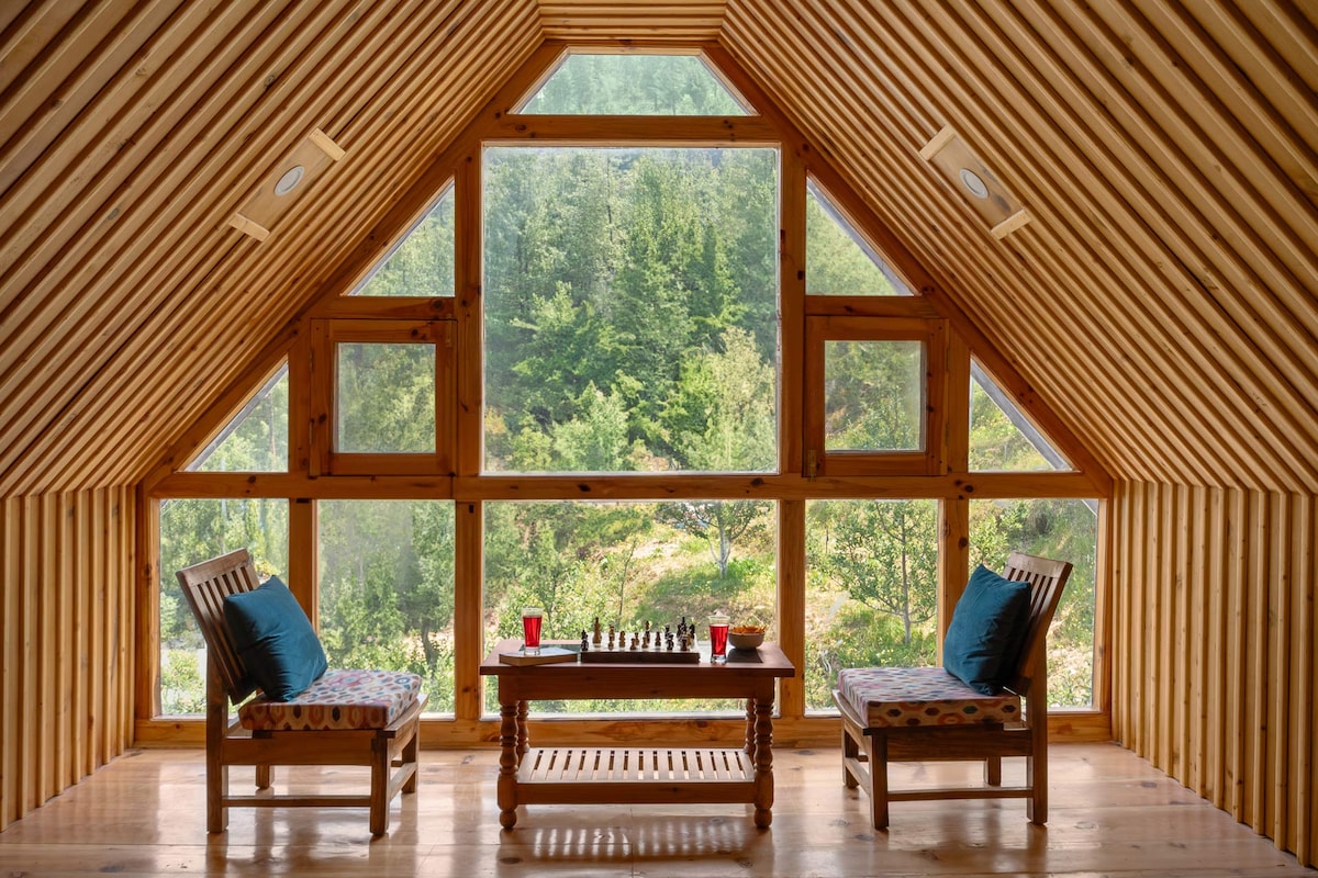 Teer Bangla, an enchanting haven near Shimla, perfectly captures the essence of the region. The name "Teer" signifies the hilly slopes, while "Bangla" refers to the traditional bungalow-style architecture, reflecting the local geography and culture. This retreat features three spacious bedrooms with warm wooden interiors, providing a cosy and inviting atmosphere. Revel in the splendid views of the majestic mountains, and enjoy the lush lawn, serene garden, and charming apple orchard.