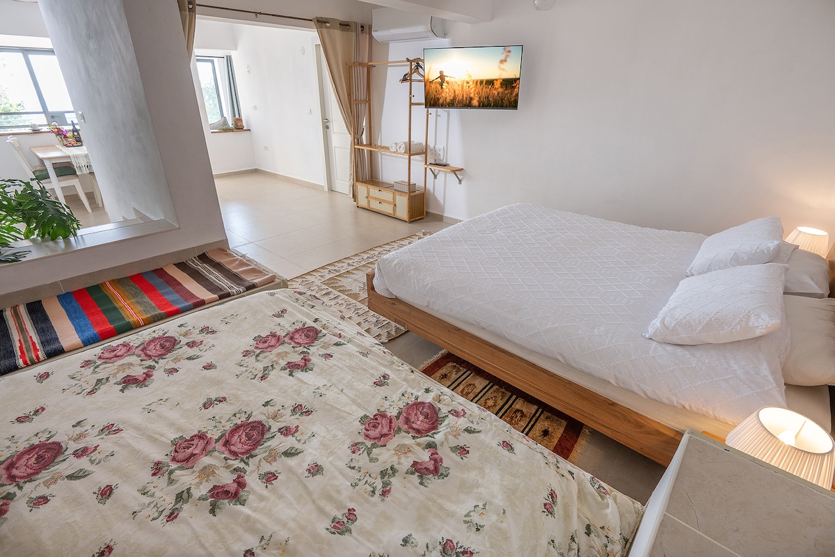 A romantic countryside guest unit in a peaceful village, offering breathtaking views of Beit Netofa Valley. Enjoy stunning sunsets, birdsong, cool summer evening breeze, and a perfect setting for relaxation. The unit includes a covered outdoor terrace with a cold/heated massage pool (MSpa jacuzzi) overlooking the view. Step onto scenic trails and immerse yourself in unforgettable nature. Ideal for couples seeking peace and a deep connection to nature (a forest just below the house).