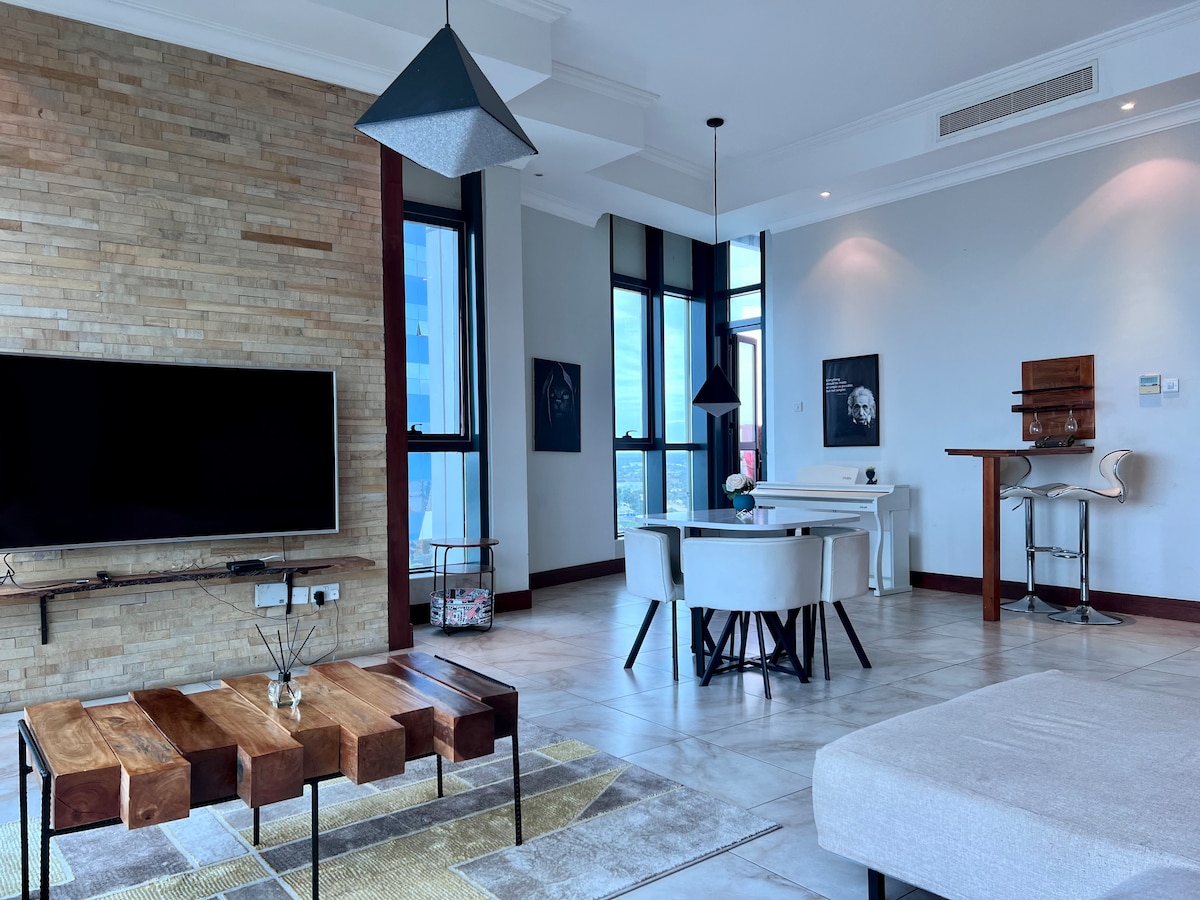 This modern 3-bedroom duplex is the perfect choice for travelers seeking a luxurious and unforgettable experience. Located in the heart of city center , this stunning property offers breathtaking views of the Indian Ocean and city skyline. With its open-plan living spaces, and exceptional decor, this duplex is the epitome of comfort. The spacious living room, with its plush sofas, floor-to-ceiling windows, and stunning ocean views, is the perfect place to unwind after a day of exploring.