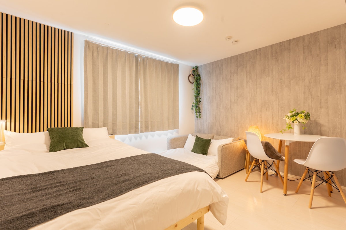 一軒家のゲストルーム。当物件は、錦糸町駅から徒歩4分。東京駅は電車で約8分、人気の観光スポットの浅草、スカイツリーは徒歩圏内なのでアクセスが大変よい立地です。家族や友人と泊まれるファミリータイプの一軒家は120㎡あり、部屋も4部屋(寝室3部屋・リビングルーム&キッチン1部屋)あります。 『家族・友人に喜ばれる家』をコンセプトにしており、広々とした空間で、最新の家具家電(TV、冷蔵庫、電子レンジ、洗濯機、乾燥機、掃除機、ドライヤーはすべて新品)が完備された一軒家なので、長期間宿泊される旅行者にも自宅のようにくつろいでいただける空間を提供いたします。 最新高速Wi-fiも完備しておりますのでワーケーションとしてもご利用可能です。駅近の物件ですが「自然豊かなのんびりとした空気」を感じさせます。 ゲストハウス徒歩1分の錦糸町公園は子供達は元気に遊べる遊具もあります。成田空港、羽田空港からバスが直通で繋がっているのでとても便利です。 東京の観光スポットである新宿や渋谷、浅草、ディズニーリゾートもアクセスしやすい立地ですが夜はゆっくり家族・友人との時間をまったりと過ごすことができます。