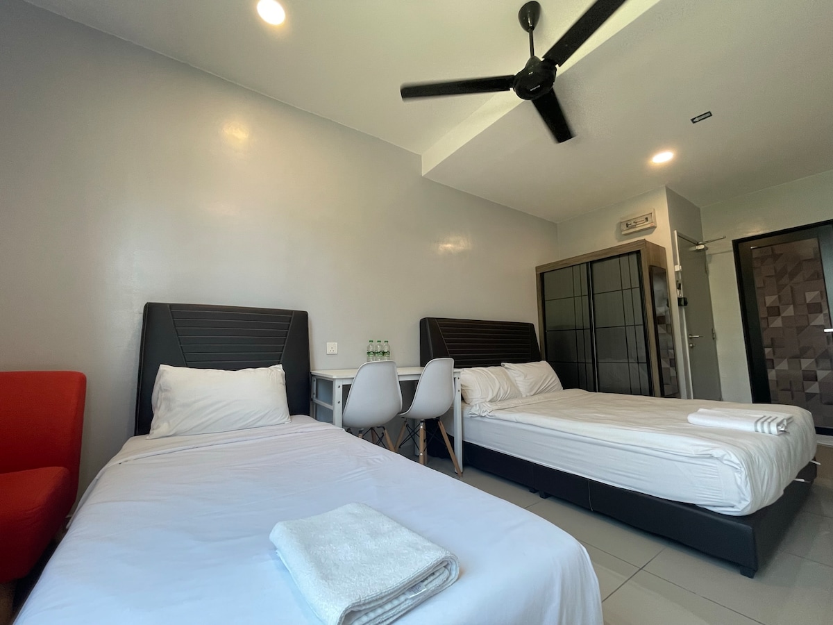 This Double Room accommodates 2 persons (Age: 7 and above only) and is completed with its own en-suite bathroom (shower with instant hot water). The room has a Queen Size bed, rack with hangers, bedside table, ceiling fan and free Wifi. **Depending on occupancy upon check-in, the reservation may be transferred to a different floor.