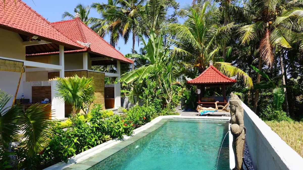 Ubud Auroville offers you the whole house with the price of a simple room at a hotel. Private kitchen, working space, and garden are all yours. Nothing to be shared Located near Ubud easy for online taxi and food delivery. Driving time: 3-10min to eatery places and Pepito supermarket 15-30min to Ubud Center, Monkey Forest, Elephant Cave. 25min to Tegenungan waterfall 30-55min to Tegalalang, Kintamani Our home is usually for longstay, but now it's available for daily too. No pet allowed