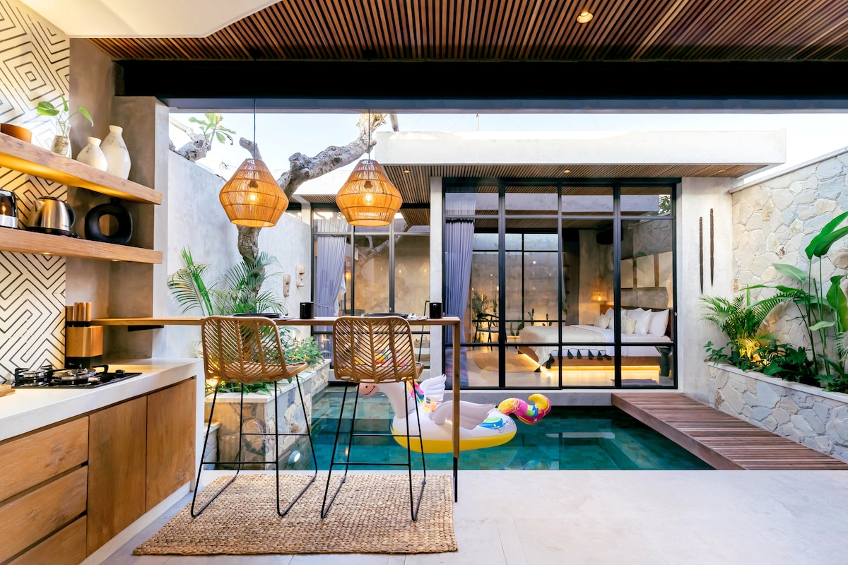 Wake up to birdsong. Step outside and dive into your own private infinity pool — palm trees, rice fields, tropical garden all around. One bedroom, new mosquito net, strong AC. Open-air kitchen and living area. West-facing for sunset enthusiasts. Rice field walks from the door. Families welcome. Pool fence available on request for your little ones. Penestanan, Ubud. 7 minutes from the centre. Daily housekeeping, WiFi, toiletries included. No TV. Just nature, silence and the occasional gecko.