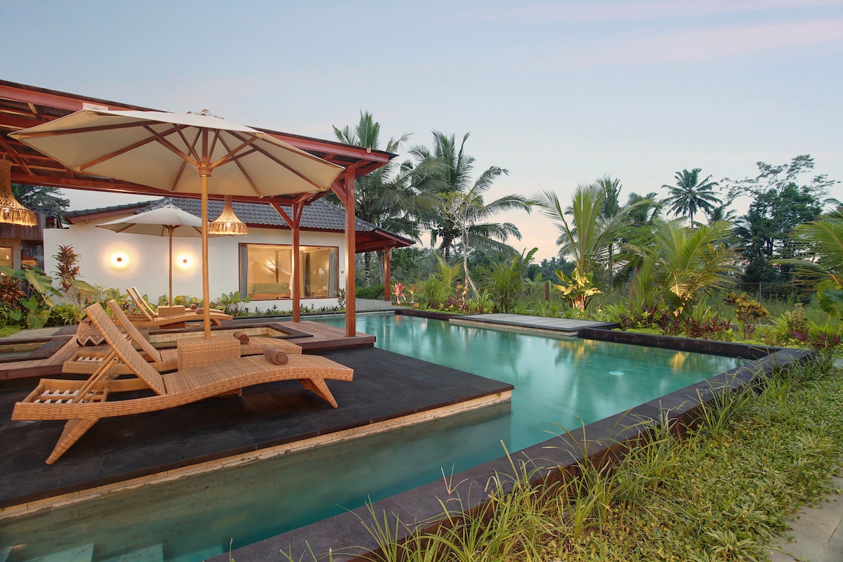 Welcome to Villa Rae, a stylish and modern villa located just outside Ubud, Bali. The villa has a private pool, 2 bedrooms, 2 bathrooms, and an outdoor tub. Villa Rae is surrounded by rice fields in a quiet neighborhood only 15 mins from the center of Ubud. Enjoy a glass of wine on the patio next to the pool or admire the sunset on your rooftop terrace. Villa Rae was designed with comfort and relaxation in mind, and you’ll find all you need to make your stay feel like home.