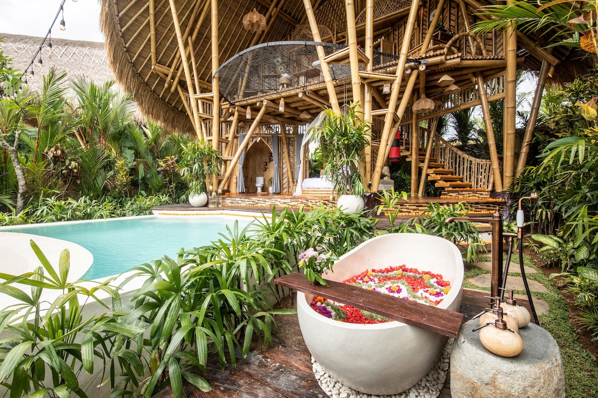 Welcome to Villa Dwipa ☀️ A place where you can indulge yourself in the beauty and luxury of a completely private Bamboo Villa and all it’s facilities surrounded by peaceful nature 🍃 From a dive in the private pool, watching a movie on the drop down cinema screen and having a neighbor-less party in the living room to spending peaceful quality time, cozily unwinding on the balcony and everything in between, whether you're friends or lovers, we guarantee you a good time 😊