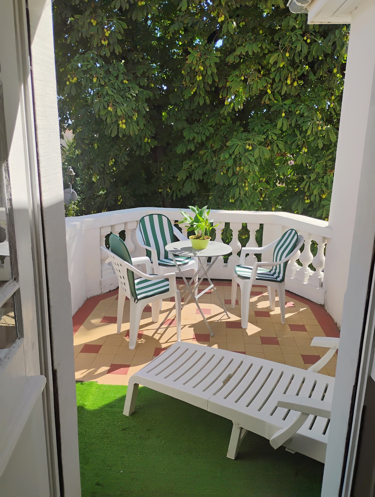 This bright apartment is located on the first floor of an annex with no neighbors. It includes a bedroom with two 90 x 190 cm beds, a reading area, a living room with a fully equipped kitchen, and a lounge area with a 160 x 198 cm sofa bed, opening onto a large furnished terrace with dining and relaxation areas.