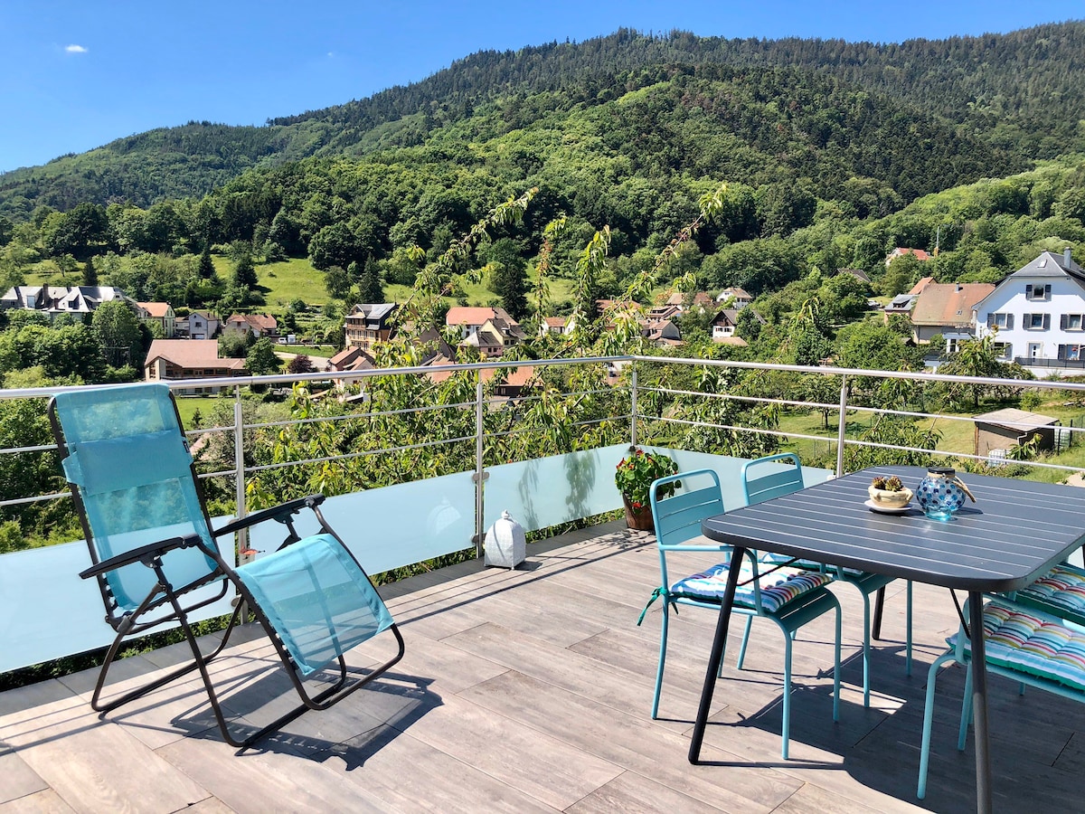 Maison d'architecte à Fréland dans un village de montagne , à 10 minutes de Kaysersberg, 20 min de Colmar, Riquewihr et des pistes de ski du Lac Blanc. Idéalement située pour les activités de montagne (ski et randonnées) , les marchés de Noël, la visite de toute l'Alsace et de notre beau vignoble. Vue magnifique sans vis à vis, vous pourrez profiter du jacuzzi sur la terrasse. La maison est équipée avec des produits haut de gamme. À votre arrivée, vous trouverez toujours le minimum nécessaire.
