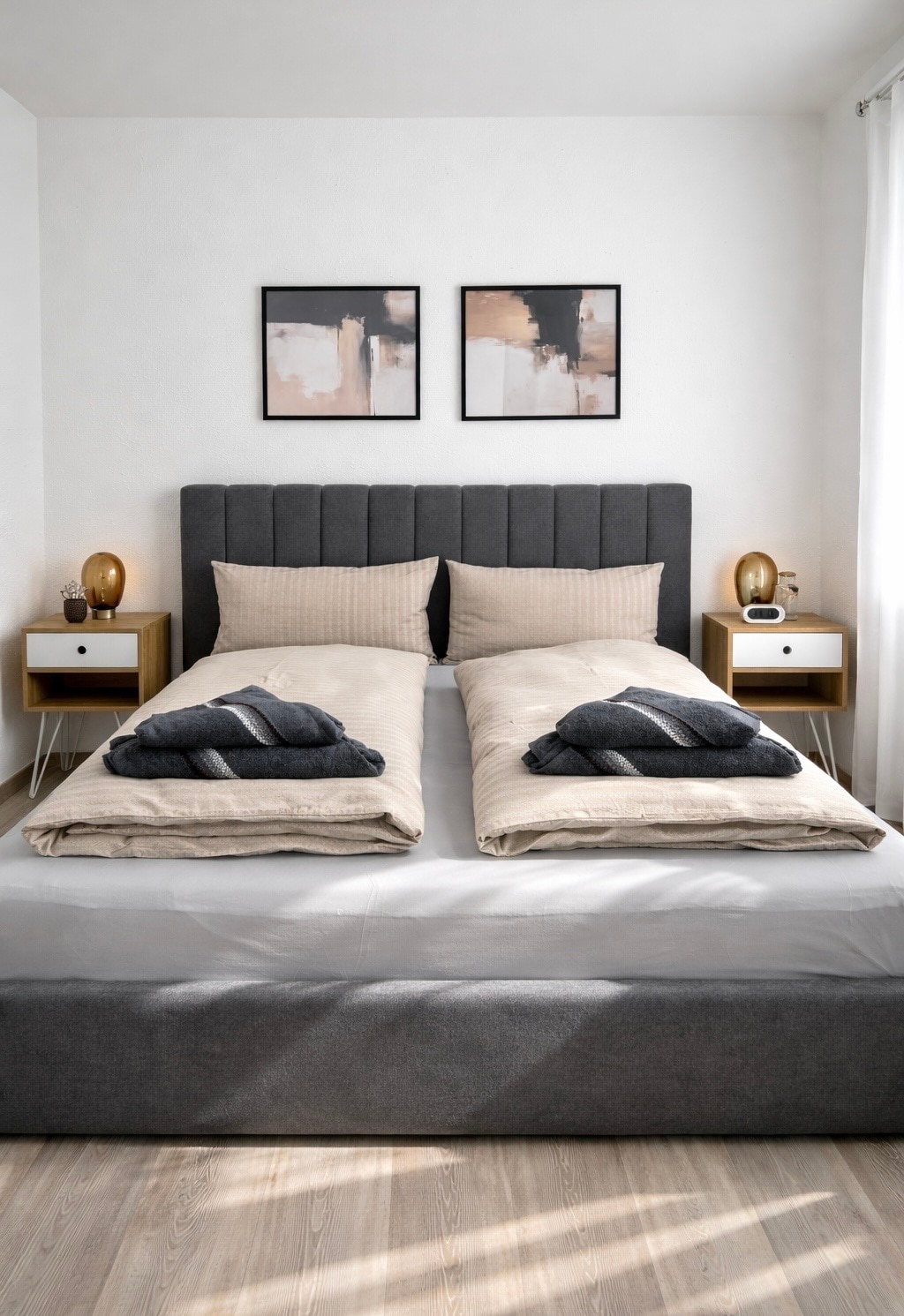 Wir bieten eine Ferienwohnung mit hoher variabler Nutzbarkeit. Die Wohnfläche erstreckt sich über zwei Ebenen. Neben dem Wohnbereich, entfaltet sich im Obergeschoss die Schlafebene als Galerie. Das Bad, mit einem auf Fußebene abgesenkten Dusch- bzw. Badebereich, könnte als dritte Wohnebene bezeichnet werden. Außerdem läd ein Balkon mit Gartenmöbeln zum Entspannen oder zum Frühstücken in der Natur ein. Überzeuge dich selbst!