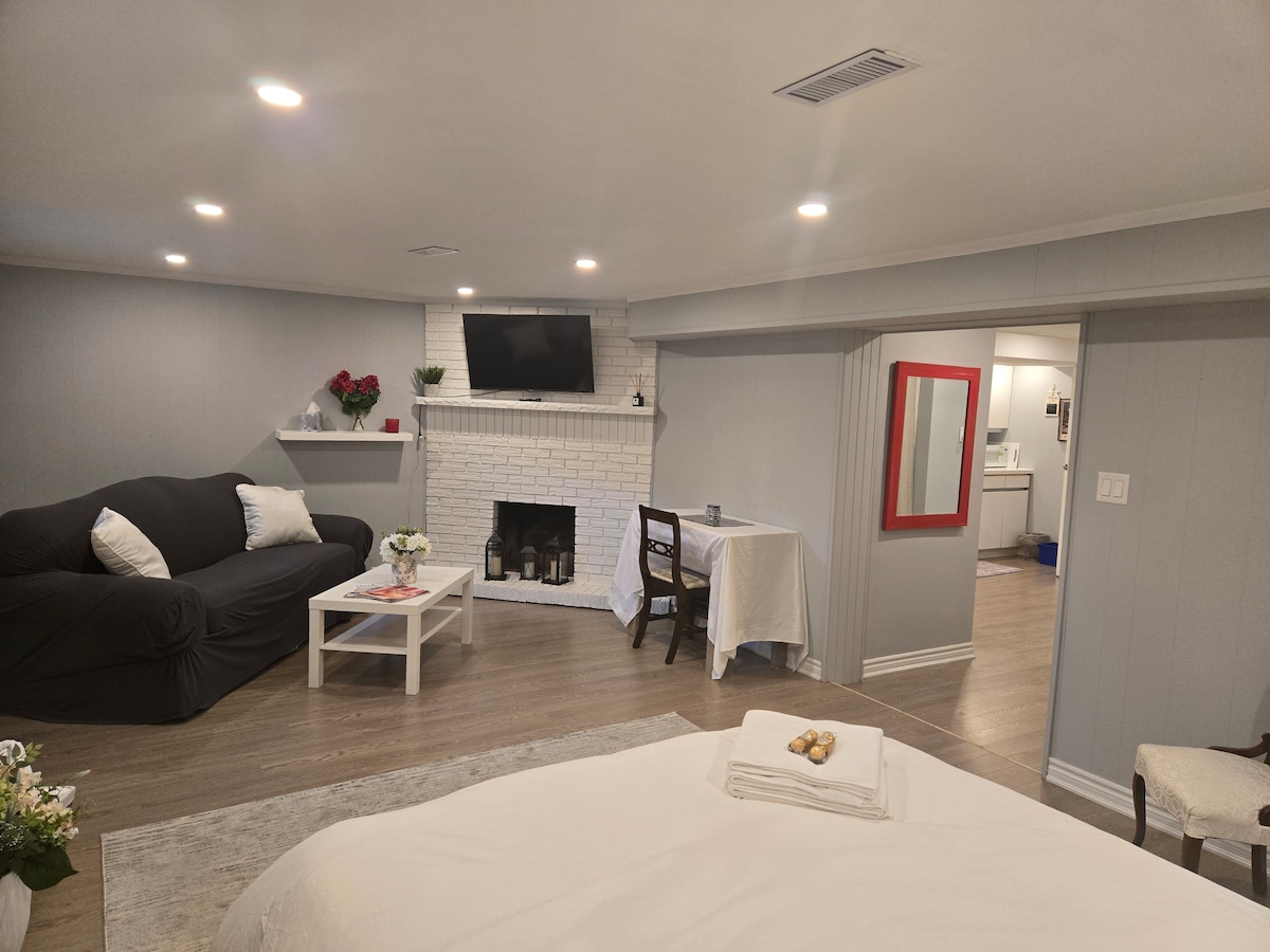 Welcome to our Cozy Studio by Toronto Pearson International Airport. Tucked away in a serene oasis, this cozy hideaway offers the perfect balance of relaxation and easy access to the airport. Unwind in the warmth of our electric fireplace after a long journey, or heat up a meal in the private kitchenette. We’re close to transit systems that can take you to downtown Toronto or the Mississauga Center in no time. This is a separate unit with a private entrance. Free parking and FireTV is included.