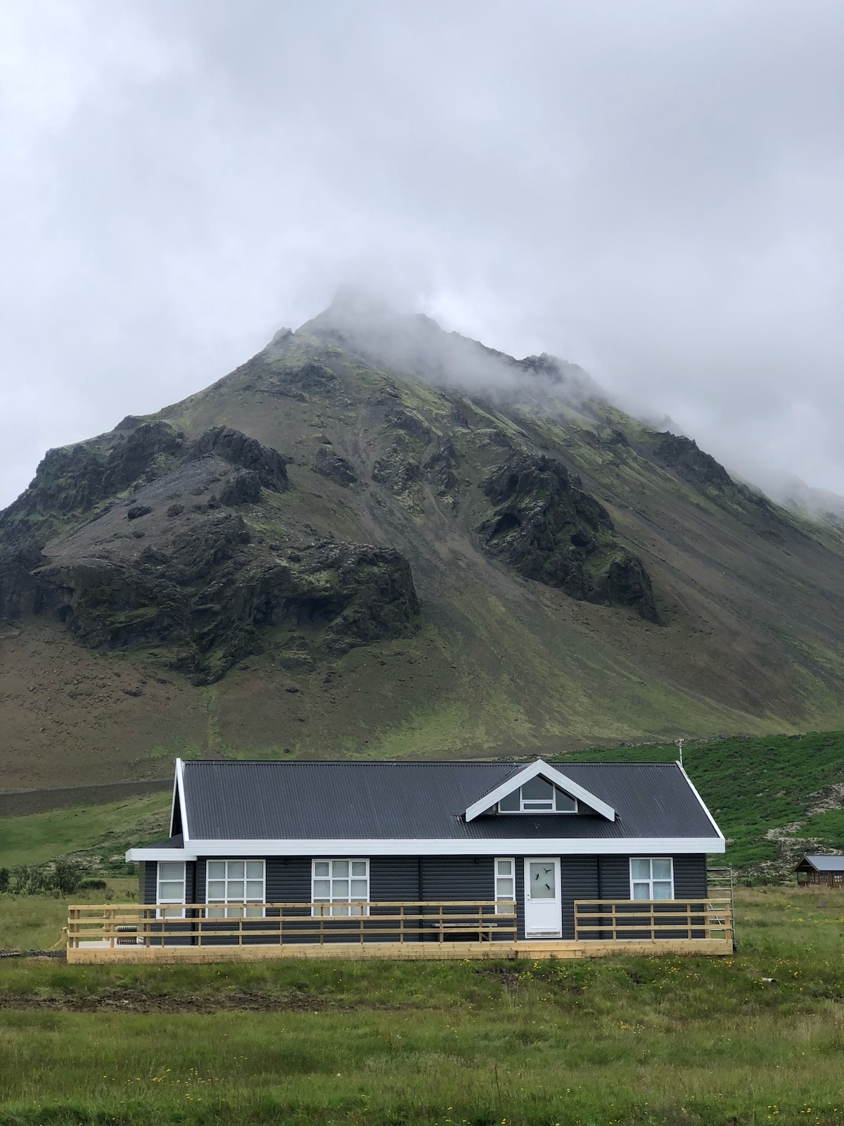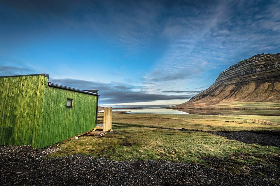 only two cottages stand on the foot of the legendary, most photographed mountain of Iceland-Kirkjufell, and this is one of them..a completely unique place in pure nature with amazing views-a few hundred meters from the waterfall Kirkjufellsfoss. The 45m2 cottage is equipped with two bedrooms, a toilet with shower, a fully equipped kitchen, a living room with a view of the valley below Kirkjufell and a hot tub on the terrace.