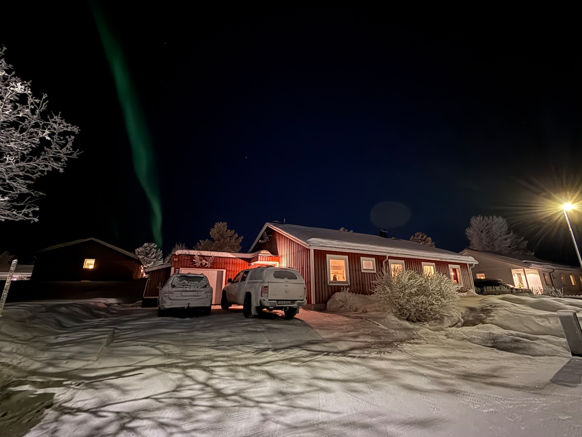 This is the perfect stay in Jukkasjärvi! We give you the possibility to stay in our private house and you get access to the whole house. 800 meters walking distance to Icehotel, next to popular Old Homestead and 200 meters from the the famous church in Jukkasjärvi. Kitchen, three bedrooms, living room with fireplace, two bathroom and sauna.