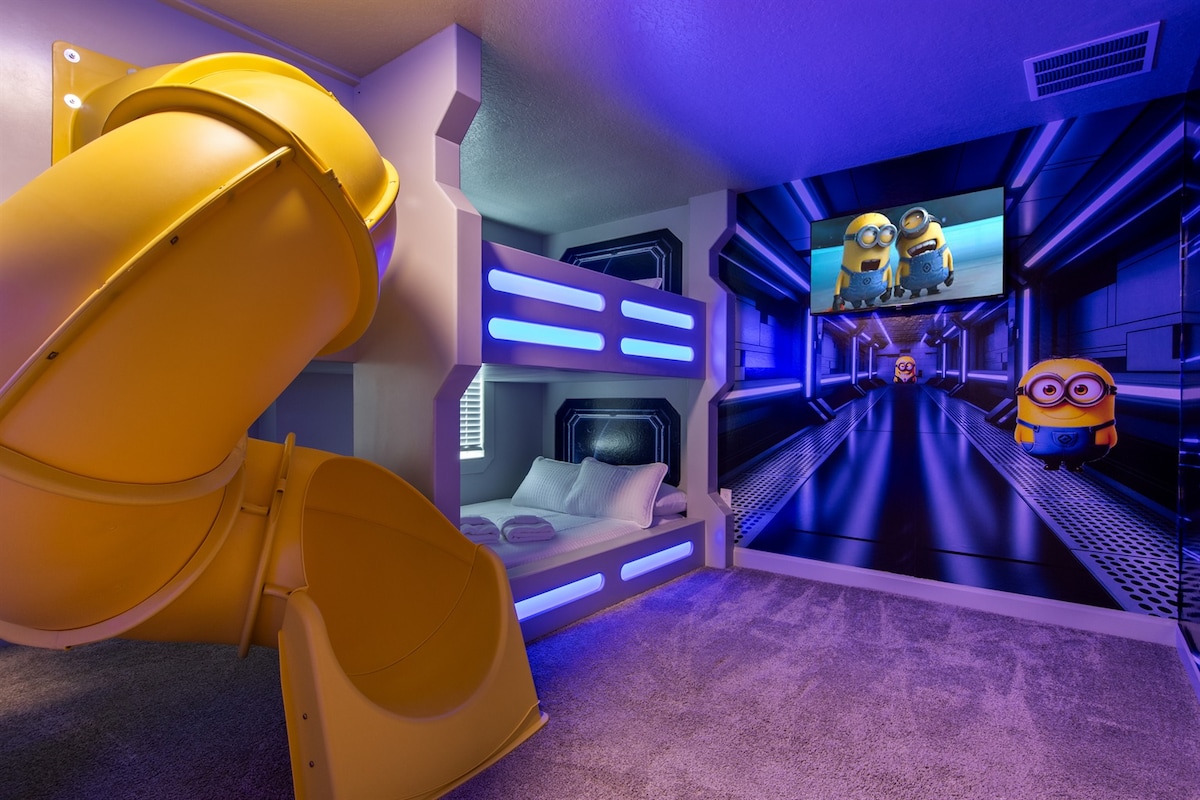 Location can't get better! Next to Disney Parks and Restaurant Row! This Guarded and gated place to stay is perfect for family trips. You will fall in love with our year round 12ft tree tastefully decorated by season. Mickey's Camping room, Frozen themed room, the cabin Christmas year round experience & 2 additional modern king rooms perfect for couples! Did I mention the stunning Avengers Home theater/game room and oversized pool?