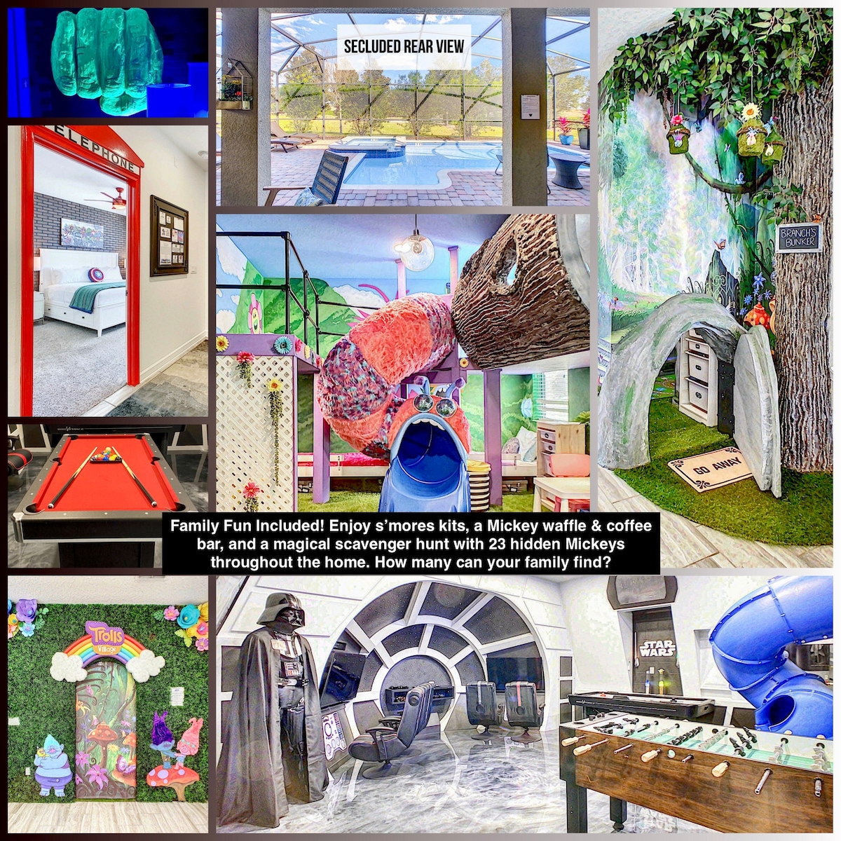 Welcome to Your Custom-Crafted Dream Vacation! Our uniquely designed home offers an extraordinary experience for your family’s ultimate getaway. Thoughtfully curated, it creates a serene retreat while your kids enjoy themed rooms, play areas, and activities. We’ve brought Disney magic to your doorstep, ensuring cherished family memories. With personalized touches and exclusive amenities, our home delivers a vacation like no other—proudly featured in WDW Magazine! See the magic in photos!