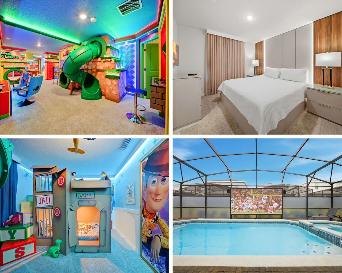 ✨ Step into your own Disney adventure! Once an NBA star’s vacation home, this villa sleeps 23 and blends luxury with fun: • 🛏 Themed Bedrooms (Frozen, Cars, Harry Potter, Star Wars & more) • 🎬 Galactic Theater w/ 86” Screen, Surround Sound, Arcade, Xbox & Nintendo • 💦 Heated Pool & Spa w/ Lounge Seating + Peaceful Forest Views • 🎢 Resort Water Parks w/ Lazy River, Pirate Ship, Water Slides & Mini Golf • 📍 Prime Location: Only 7 Miles to Disney & 19 Miles to MCO attractions