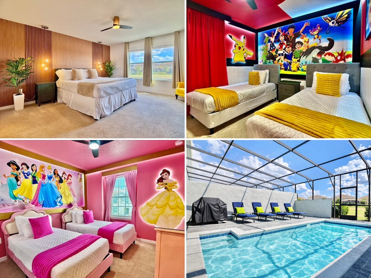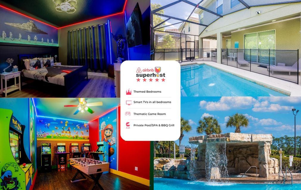 Welcome to Mickey's Mansion, your magical vacation rental in the heart of Champions Gate! Located just 10 miles away from the entrance of WDW, our rental is the perfect place to stay for your Disney vacation. Our 5 star home features 8 themed bedrooms and 5 bathrooms, a fully-equipped kitchen, private heated pool, private arcade, home theater & BBQ! Pool heat & the 1st tank of propane for the BBQ is included. Booking with us includes full access to the Champions Gate Clubhouse & Oasis Resort