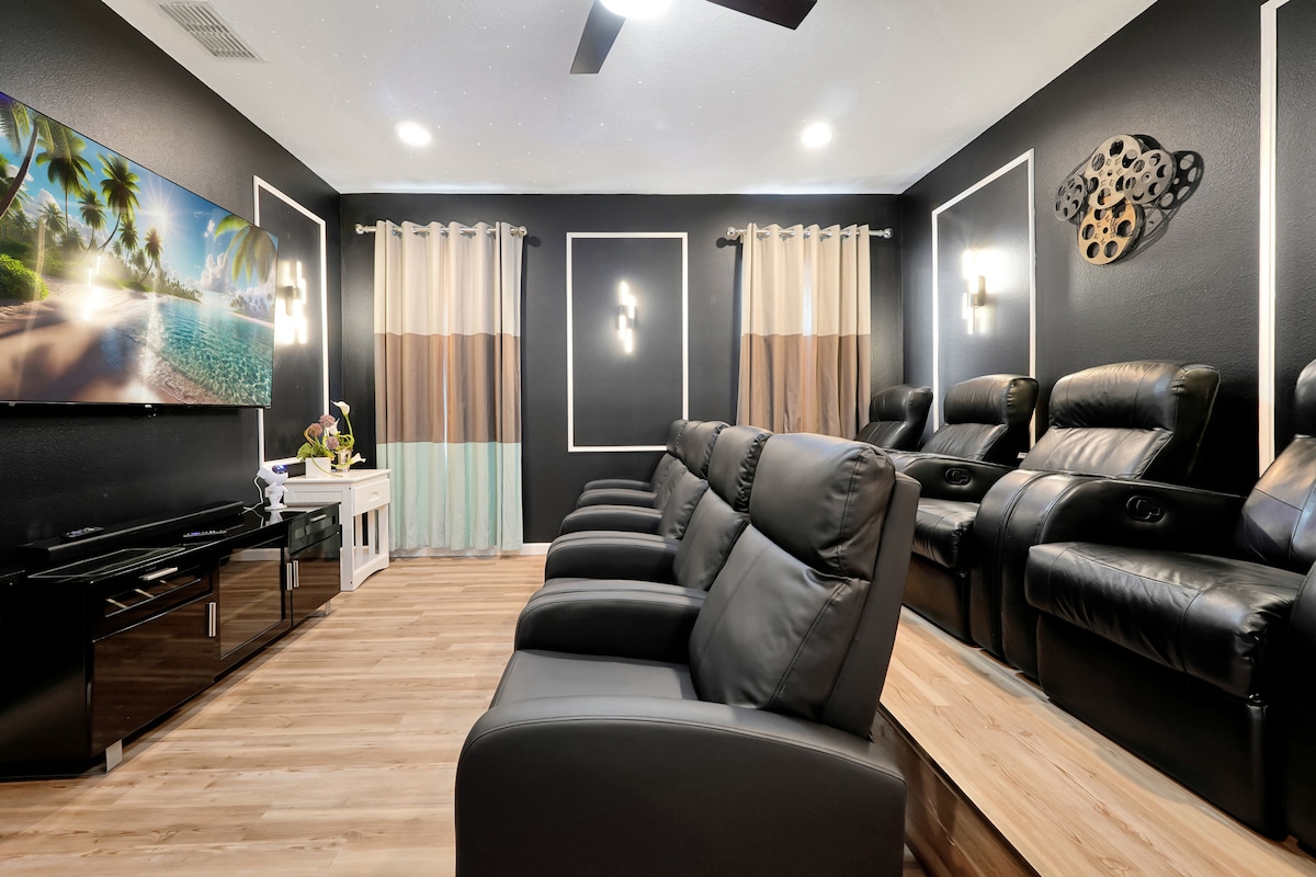 A vacation home that takes your entertainment seriously! That’s our 8-bedroom villa in Emerald Island Resort at 3 miles from Disney… Ready to enjoy themed bedrooms, a premium private movie theater with a 155-inch screen, 4K projector, 5.1 surround sound, and a PS5 for gaming? Relive your favorite films in stunning quality, just like in the best movie theaters. Private Pool and Spa will make your vacation unforgettable! We’re ready for families and groups, to offer fun, comfort, and luxury.
