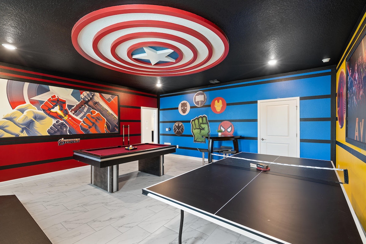 Stylish Design, Luxurious Comfort & Endless Entertainment, with a sprawling 2200 ft2 southwest facing pool deck & outdoor kitchen, no rear neighbors on a beautiful forest in the stunning 3.5 square mile Reunion Resort. You will have your own private pool with overflow spa, movie room, billiards - game room, 4 theme rooms: OUTER SPACE, MARVEL SUPERHEROES with a TUBE SLIDE, FROZEN II, HARRY POTTER CUPBOARD, PS5, within minutes to Disney.