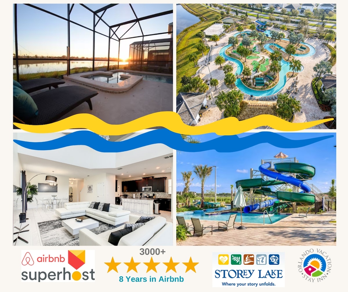 Enjoy comfort, style, and location at this 5-Bedroom / 5-Bathroom single-family resort pool home in Storey Lake. Features 2 King en-suites, 1 King bedroom, Star Wars and Mickey themed bedrooms, fully stocked kitchen, open living area, and private pool and spa (hot tub). Resort amenities include pools, lazy river, slides, splash pad, fitness center, and sports courts—all minutes from Disney, Universal, and shopping.