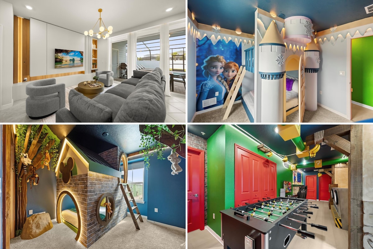 ☆ IMMERSIVE Mario Themed Game room ☆ EPIC custom-themed Avengers Bedroom ☆ EPIC custom-themed Moana Bedroom ☆ Private pool and spa ☆ Golf course views ☆ Fully Stocked Kitchen & Coffee Bar ☆ Ultra Comfortable Beds ☆ 2 Luxury King Suites + 1 Queen Suite ☆ Popcorn Maker with supplies ☆ Access to exclusive restaurants ☆ Minutes to Disney World and Universal Studios