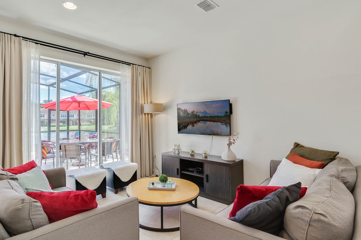 Sit back and relax in this stylish home with all the amenities you need for a fun family getaway. This home has a spacious layout with 3 bedrooms and 2 baths. We have thought of everything so you don't have to-toiletries,washer/dryer, and wifi. Enjoy your morning coffee in the screened in pool area with a beautiful sunrise and lake view or sip a glass of wine while floating in the pool. Just minutes to Theme Parks and major highways, this is the dream home you have been waiting for!