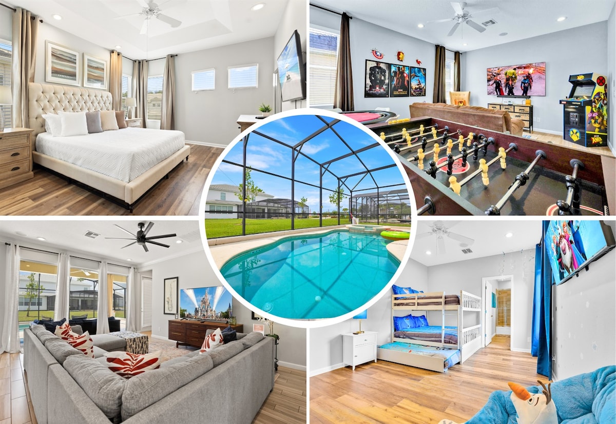 Appx. 5 min from Disney World parks, & close to all other theme parks & Convention Center (with daily free shuttles to/from theme parks and malls). Stunning 6 bed/5 baths 5 star Home with Top Resort type amenities, and private backyard pool/hot tub/ and gaming room. We have 2 exclusives themed rooms WHICH are A KID'S DREAM! This is professionally decorated and includes top quality mattresses, furnishings, fully equipped, large flat screen TV's in all bedrooms.