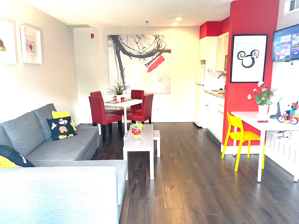 Completely NEW furniture with Simons mattresses! Only 10 mins to Disney! No more stuck in traffic. Free parking and free essentials for our guests and worry-free check in process. This recent updated Disney decorated Villa is centrally located and close to all shopping, parks and restaurants, 2 full size beds with BEAUTYREST mattresses, a queen size sofa bed, full bath, and everything you need! Only Minutes from all seven Orlando area theme parks. Enjoy the pool, jacuzzi and club house!e