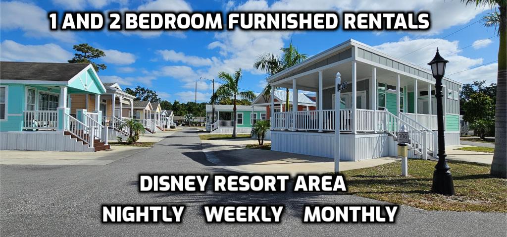 Quaint cottage with high-end appliances, perfect for business travelers or small families. Fully equipped kitchen. Lovely porch. Comfortable loving room with 2 recliners. A/C and 5 fans keep the unit cool! Full use of facilities: pools, gym, reception area, game room, miniature golf. 5 minutes from Disney, walking distance to Old Town. Why stay in a hotel when you can stay in Jubilee Cottage??