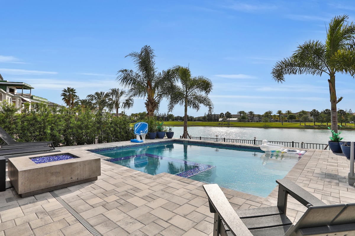 LIMITED PROMOTION! FREE CLEANING FOR BOOKING 2 WKS OR MORE! LOWEST CLEANING FEE! Military dscnts. New Pool Heatr, Dolby ATMOS, 65" LED TV w/ Airplay. Remote office setup. Sunset Lakes a secure gated comnty ~12 min from Disney & other parks. Villa offers Lake View pvt pool, gorgeous sunset, Playroom, Fishing dock. Fully furnished, sparkling clean w/ 5 bds - 1 King, 2 Qns, 2 Twin beds w/ 3 baths, kitchen & lndry. Come & enjoy your next trip to Disney & leave everything to a fantastic experience!
