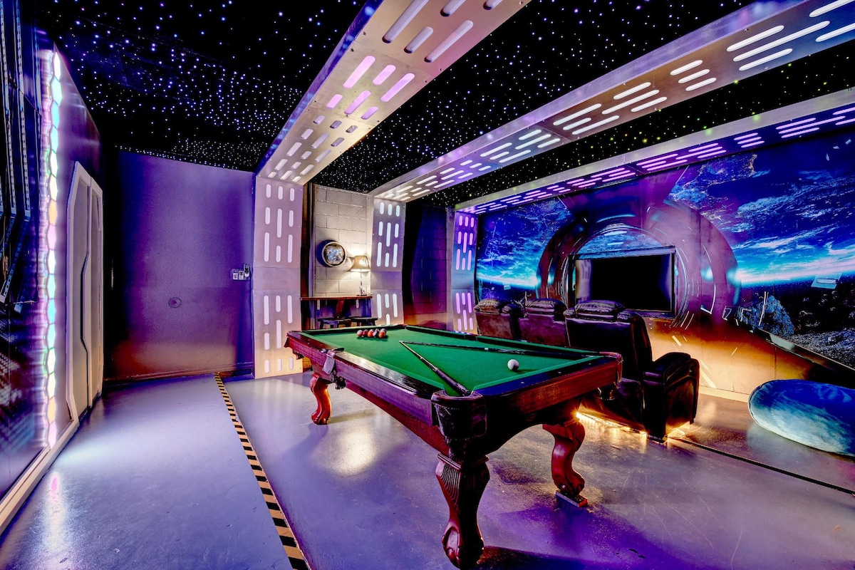 ✨ Step into your own Disney adventure! Once an NBA star’s vacation home, this villa sleeps 23 and blends luxury with fun: • 🛏 Themed Bedrooms (Frozen, Cars, Harry Potter, Star Wars & more) • 🎬 Galactic Theater w/ 86” Screen, Surround Sound, Arcade, Xbox & Nintendo • 💦 Heated Pool & Spa w/ Lounge Seating + Peaceful Forest Views • 🎢 Resort Water Parks w/ Lazy River, Pirate Ship, Water Slides & Mini Golf • 📍 Prime Location: Only 7 Miles to Disney & 19 Miles to MCO attractions