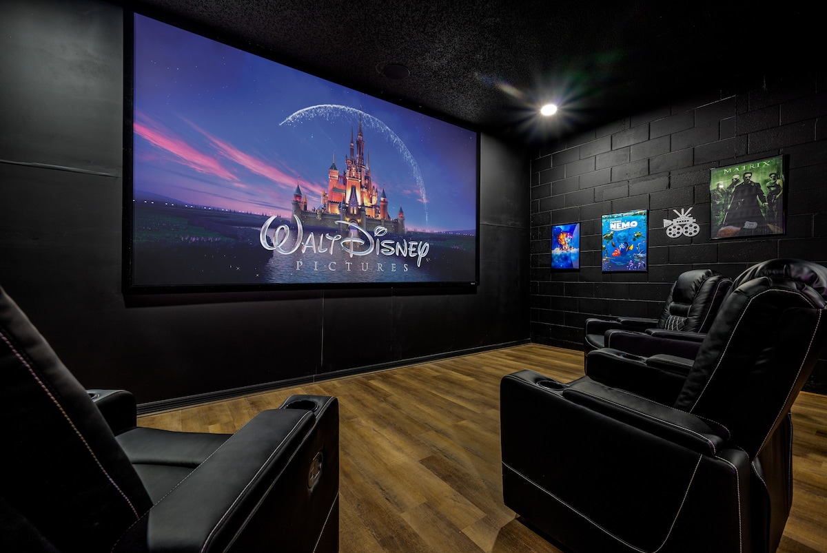 A vacation home that takes your entertainment seriously! That’s our 8-bedroom villa in Emerald Island Resort at 3 miles from Disney… Ready to enjoy themed bedrooms, a premium private movie theater with a 155-inch screen, 4K projector, 5.1 surround sound, and a PS5 for gaming? Relive your favorite films in stunning quality, just like in the best movie theaters. Private Pool and Spa will make your vacation unforgettable! We’re ready for families and groups, to offer fun, comfort, and luxury.