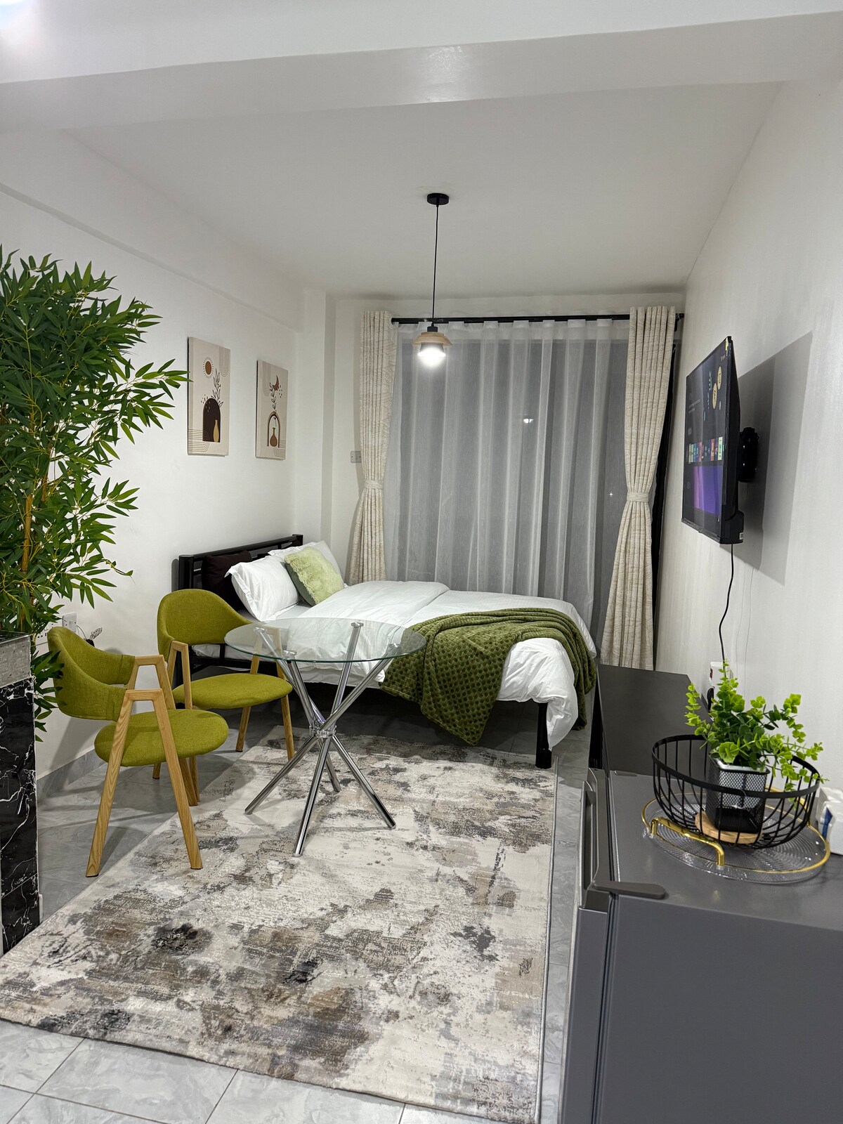 Unwind with ease in this peaceful, serene, and centrally-located haven. Relax in the cozy bedroom featuring a double bed, fresh linens, and a large window that invites in natural light. The room is equipped with a kitchenette, a smart TV, and fast Wi-Fi for your convenience. Situated in a private compound with wheelchair accessibility. Parking is available, and a reliable warm shower awaits you. The compound is well-maintained and secured by 24-hour security for your safety and peace of mind.