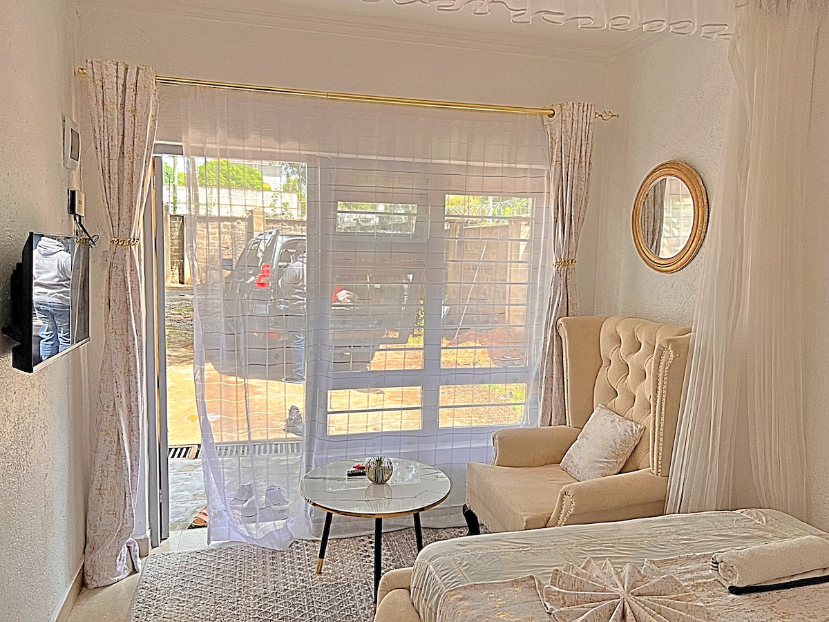 Unwind with ease in this peaceful, serene, and centrally-located haven. Relax in the cozy bedroom featuring a double bed, fresh linens, and a large window that invites in natural light. The room is equipped with a kitchenette, a smart TV, and fast Wi-Fi for your convenience. Situated in a private compound with wheelchair accessibility. Parking is available, and a reliable warm shower awaits you. The compound is well-maintained and secured by 24-hour security for your safety and peace of mind.