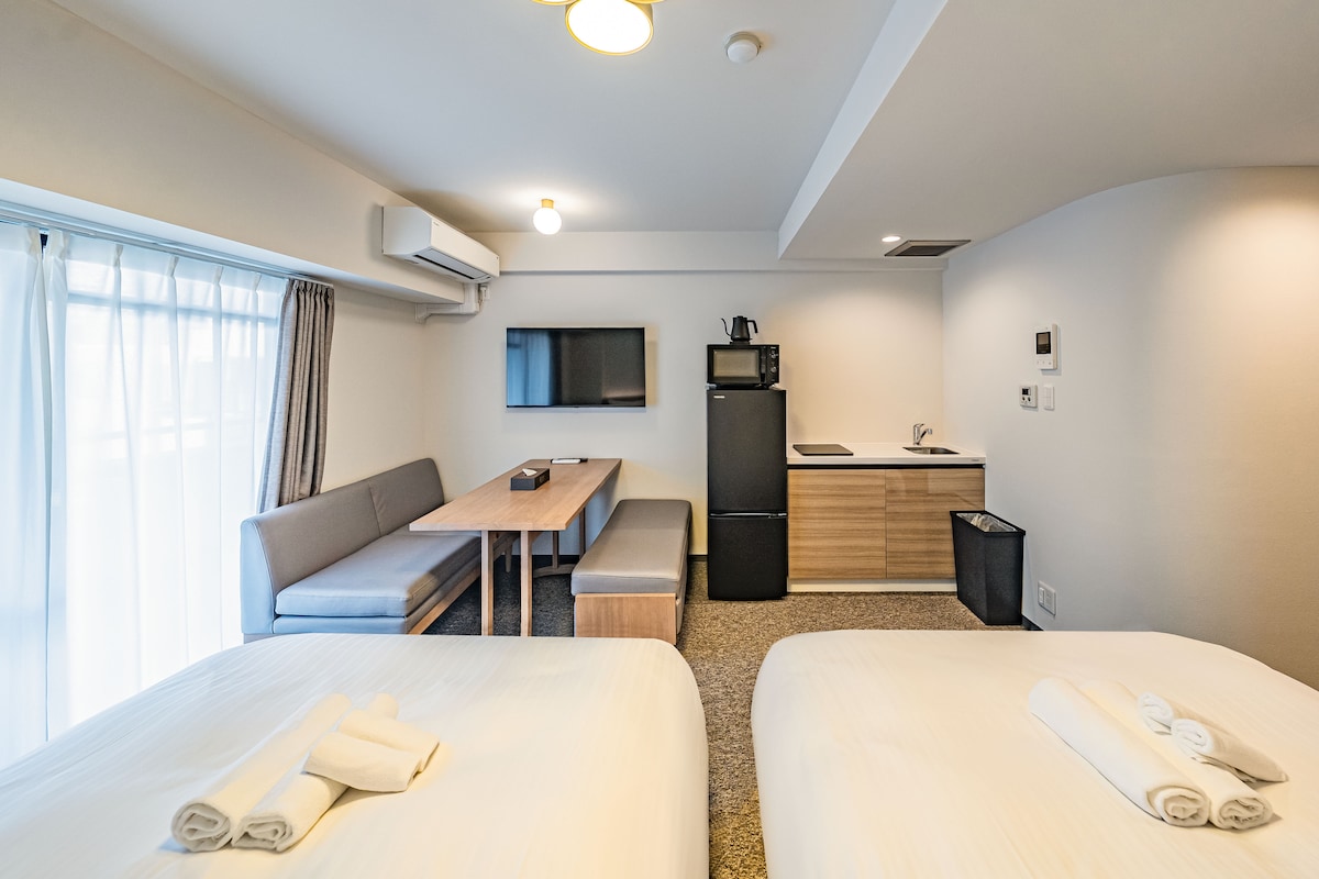 ◆房源位置 位于大阪大国町,步行2分钟可到达地铁站,交通十分便利。 房源邻近难波、道顿堀、心斋桥、天王寺,搭乘地铁仅需一站,也可步行前往多个大阪热门商圈与景点。 距离大国町地铁站约180米,周边有木津市场、难波八坂神社等大阪人气打卡地点,观光、美食、购物都非常方便。 ◆房源空间 适合家庭或小型团队入住的日式公寓,最多可容纳4位客人。 房内配有: 2间双人卧室 独立客厅 独立厨房 独立卫生间与浴室 无论是家庭出游、朋友结伴旅行,还是大阪自由行短住,都非常合适。 ◆交通便利 步行范围内可到达多个车站和线路,包括: 大阪地铁御堂筋线 大阪地铁四桥线 JR环状线 南海线 前往关西机场:可搭乘南海线,约45分钟直达,无需换乘。 前往环球影城(USJ):搭乘JR约25分钟即可到达。 前往难波、道顿堀、心斋桥、天王寺、日本桥等大阪主要区域也都十分方便。 ◆入住须知 入住期间每位客人免费提供1条全新毛巾。 如需额外毛巾,可付费购买,每条200日元。 入住期间不提供房间清洁服务。 为避免影响邻居,晚上10点后请保持安静。 大楼内全面禁烟。 如需吸烟,请前往1楼门外自动贩卖机附近,并请勿乱丢烟蒂。