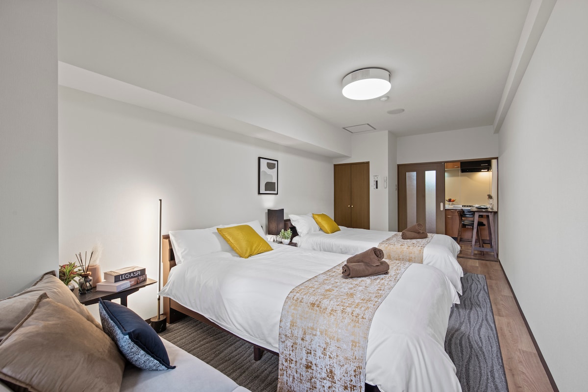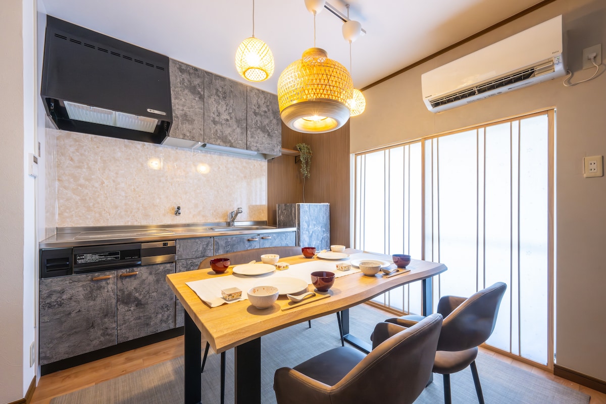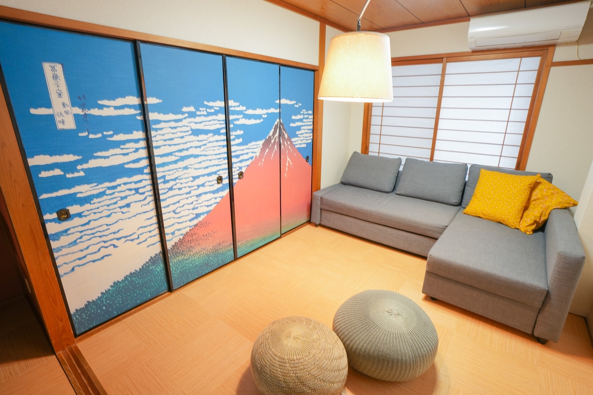 ✨We are offering 30% OFF for opening campaign. ✨ You are lucky to find this room. Don't miss this rare opportunity✨ Welcome to our spacious 2LDK (3 bedroom) room, where you’ll have the entire 75 sqm space to yourself. 100 inch screen is impressive! Please enjoy Japanese art works in this room. Located just a 4-minute walk from nearest station, which is conveniently accessible by four train lines. This room offers the perfect base for exploring not only Osaka but also Kyoto and beyond.