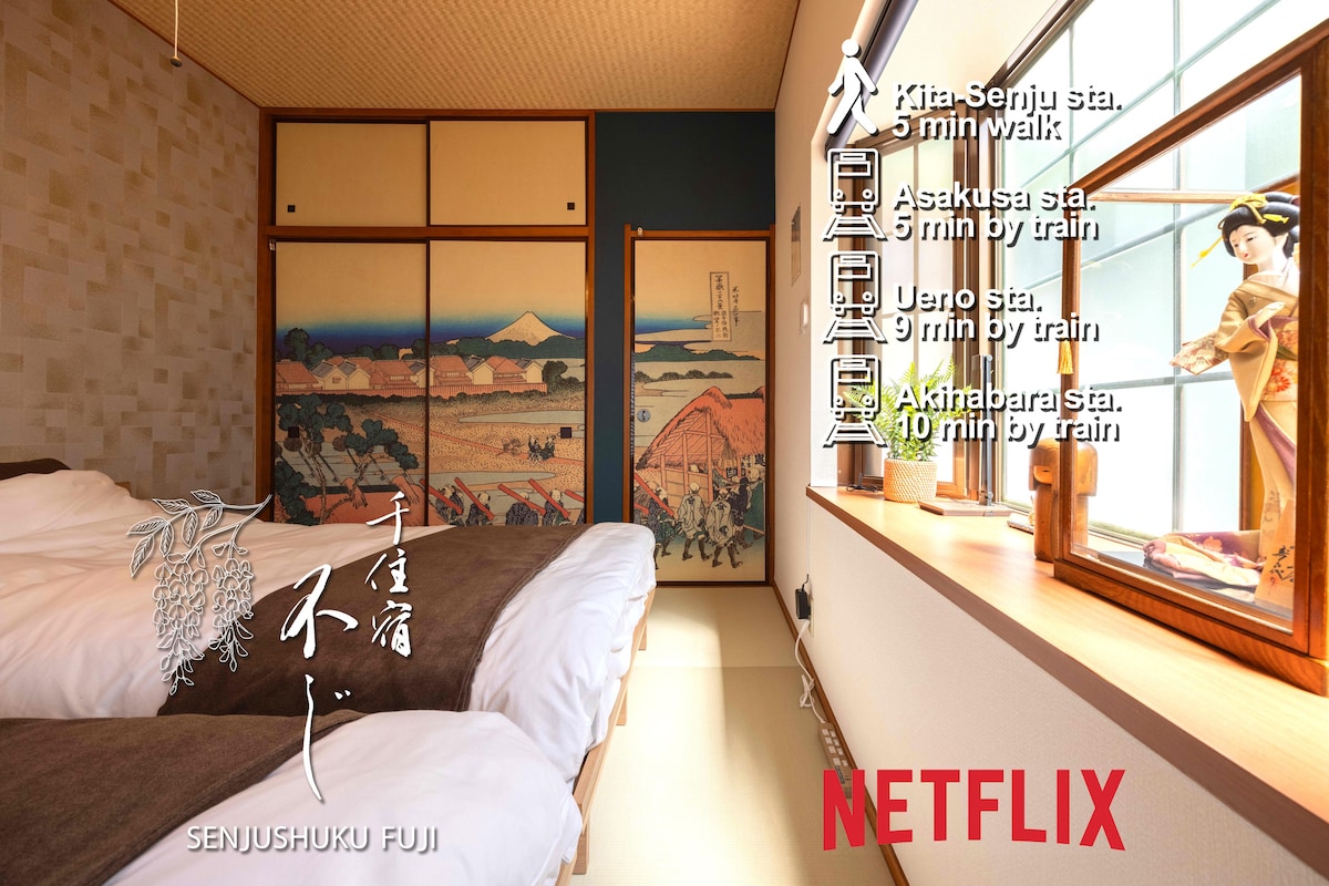 【Winter Sale 開催中】暖房完備で快適滞在! 「東京観光の拠点に最適!浅草・上野・秋葉原へ好アクセス、和の趣あるれる清潔で快適な宿」 こんにちは、Senjushuku Fujiへようこそ! 東京メトロ日比谷線北千住駅から徒歩5分、充実した設備で東京での暮らしを満喫できる、清潔なAirbnbです。浅草まで電車で5分、上野まで9分、秋葉原までは10分で到着します。 【家族旅行や長期滞在に最適】 最大6名宿泊可能なお部屋は全室エアコン付き。使い勝手の良いキッチンは豊富なキッチンツールがあり、料理を楽しみたい方にもお勧め。スーパーは徒歩30秒と近く、青果店も徒歩1分と快適な滞在になることでしょう。 ◆交通 *最寄駅へ徒歩5分* 浅草駅まで5分/つくばエクスプレス 北千住駅ーTX浅草駅 上野駅まで9分/東京メトロ日比谷線 北千住駅ー上野駅 東京駅まで17分/JR常磐線 北千住駅ー東京駅 *空港から便利* 成田空港から51分/京成スカイライナー 成田空港ーJR日暮里駅ー北千住駅 羽田空港から40-70分/直通シャトルバス