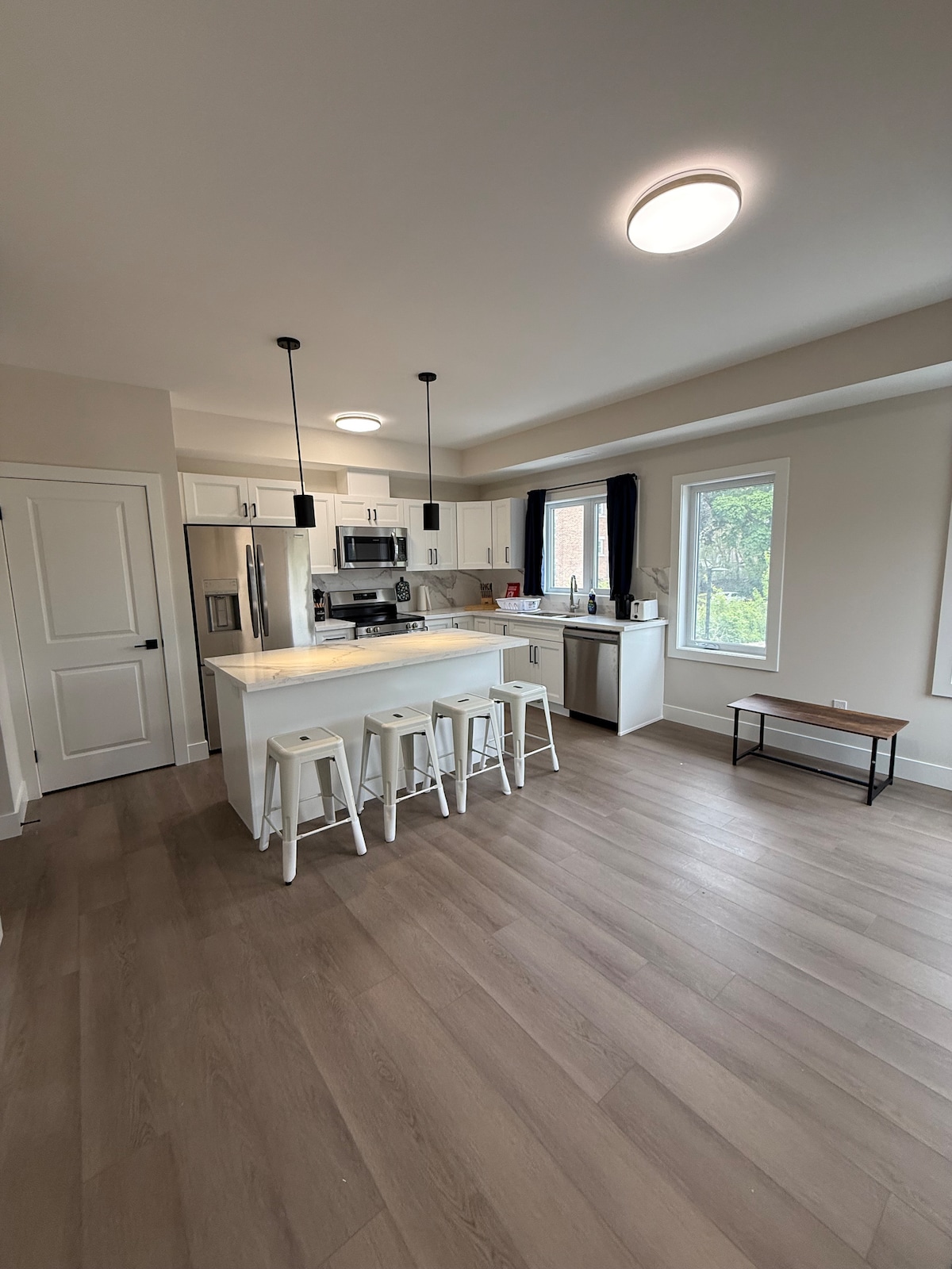 Enjoy a stylish experience at this centrally located place walking distance to the Cambridge Mill. This 4 bedroom, 1 bathroom home has in-suite laundry and two living rooms and can accommodate 8 guests. There are 2 outdoor parking spots. This newly renovated home has a beautiful, open concept kitchen with quartz countertops and a separate dining area. You’re a quick walk to downtown Galt and a 3 min drive to Tapestry Hall.