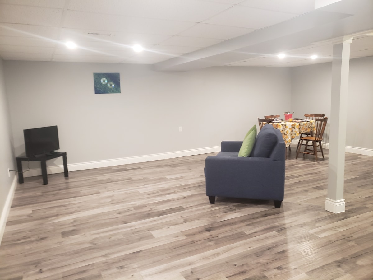 You'll feel right at home in this big, bright suite featuring private entry, full kitchen with all amenities, dining room that seats 6, 2 bedrooms with cozy beds, La-Z-Boy pull out queen bed in living room and roll away cot that can fit in many places. Bonus: work space with window and 7’x5’ walk in closet/storage room! Room for 2 guest cars in driveway, steps to transit, minutes to highways. Lots of natural light & walk out to yard. Relax & enjoy Smart TV, Disney+, Crave, books, DVDs.