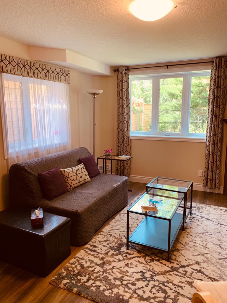 Welcome to your home away from home, with lots of natural lighting and a view with a country feel. This private 800 sq ft freshly painted apartment has a newly renovated kitchen, bathroom with a walk in shower and jetted tub, and a spacious bedroom. The main area has a new Smart TV, couches, fireplace, desk with office supplies and printer, a bar, and light workout supplies. Located in the city core of Guelph, close to Guelph Lake, University of Guelph and Rockwood Conservation.
