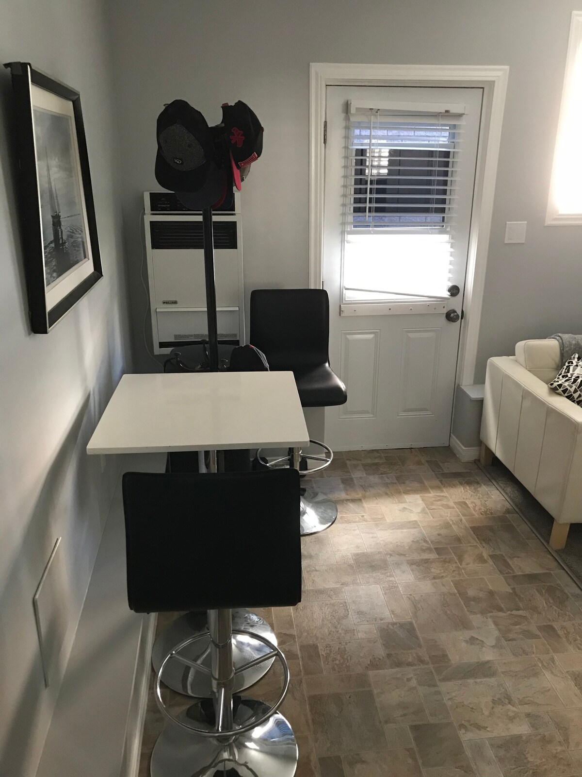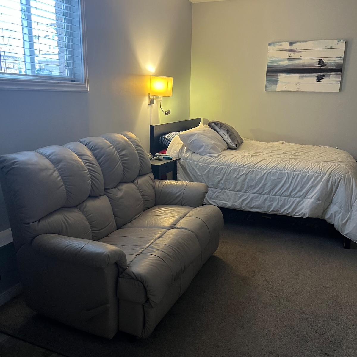 Private entrance into a large (10x20) bedroom-sitting room. The room has been recently renovated and equipped with mini fridge, double bed, reclining chair, desk and chair. A two piece washroom is located inside the house directly across from your room. Fast Wifi, shared shower/bath upstairs. Perfect for student or individual. Parking on street from April-November.