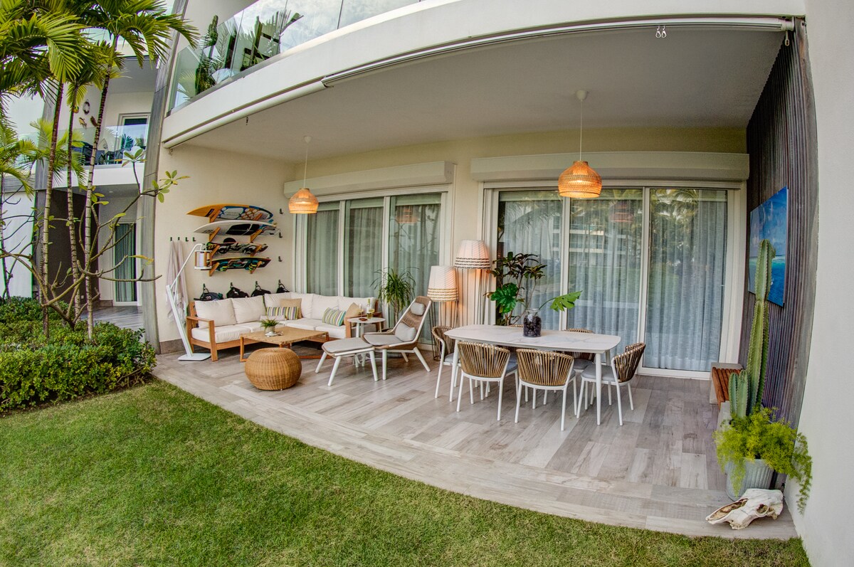 Escape to this NEW Luxurious and Modern Beachfront Condo on Playa Dorada Puerto Plata, Dominican Republic. All needed to enjoy a pleasant, peaceful and safe stay; with direct access to the beach, the double terrace that leads you to the swimming pool, a gazebo and gym; accessible upscale golf campus, restaurants inside the complex, close to shopping center, the international airport, and many attractions like water park, cable cars, historic center, nightclubs and more.