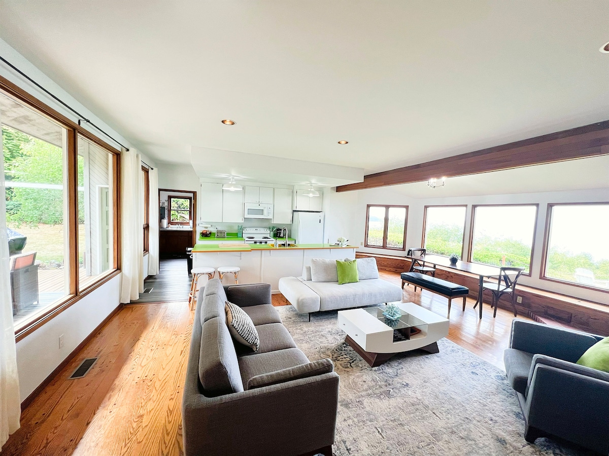 3 bedrooms · 2 baths · gym · dog-friendly Welcome to Mother Pearl, a rare waterfront sanctuary on Puget Sound where life genuinely slows down. This isn't just a beautiful house with extraordinary views. It's a place where you wake to bald eagles riding thermals over the water, deer wander the garden at dusk, and the only sound is wind, birdsong, and the rhythm of the Sound. For guests coming to rest, reset, or reconnect, Mother Pearl delivers something most vacation rentals simply cannot.
