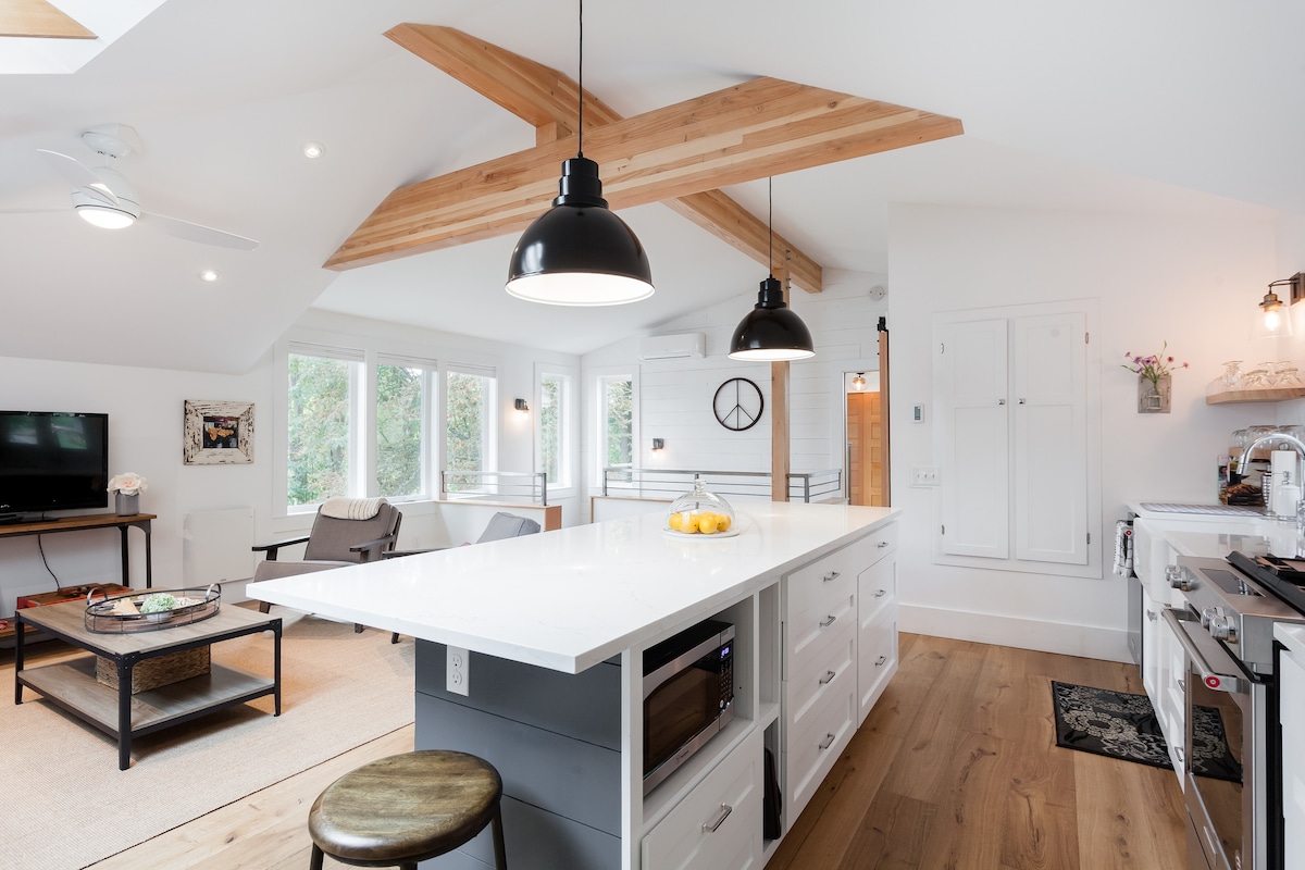 Sleep near the stars and wake up to the birds in this private, studio guesthouse. Top to bottom this is a special place. Vaulted ceilings and sky lights allow natural sunlight to filter in above. Rustic hardwood floors, milled from the properties maple trees, gleam at your feet below. Open, modern kitchen complete with granite counters, stove, cooktop, refrigerator, microwave, coffee maker, toaster and everything you need to cook and eat at home. Private entrance and deck with outdoor seating allow you to enjoy nature as deer roam through the garden and birds dart around the trees.
